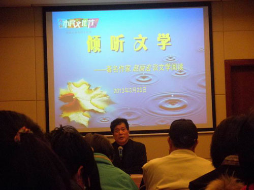 2013年3月23日,上海市第五十四中学高一阅读素养班的部分学生在老师的带领下,参加了由天平社区承办 “倾听文学——赵丽宏谈文学阅读” 讲座。该讲座是“首届上海市民文化节”系列活动之一,目的是为了感受书籍的智慧与力量,提升阅读的方法与技巧。