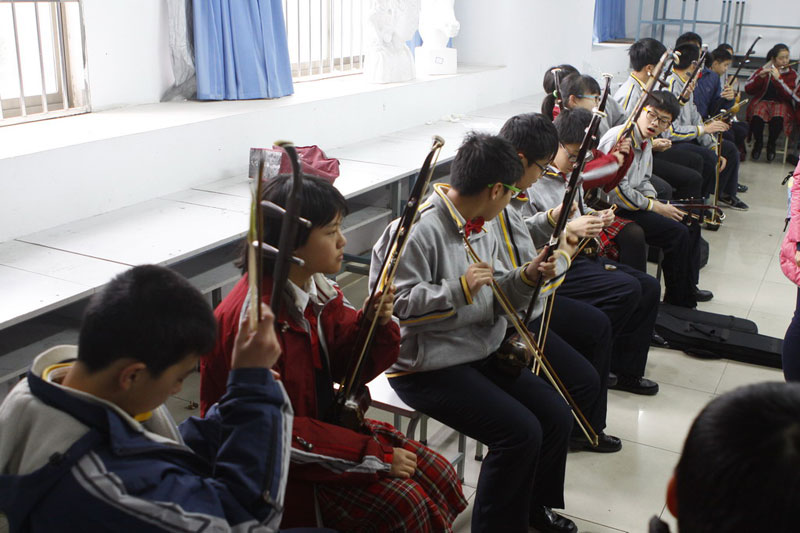 2013年12月14日,丝竹音色悠扬顿挫,鼓点欢快激昂,上海市第五十四中学民乐团正在金华职业技术学院实验剧院里演奏经典曲目《高山青》。